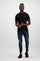 Men’s dark grey t-shirt, distressed dark blue jogger jeans, and black and orange athletic shoes.