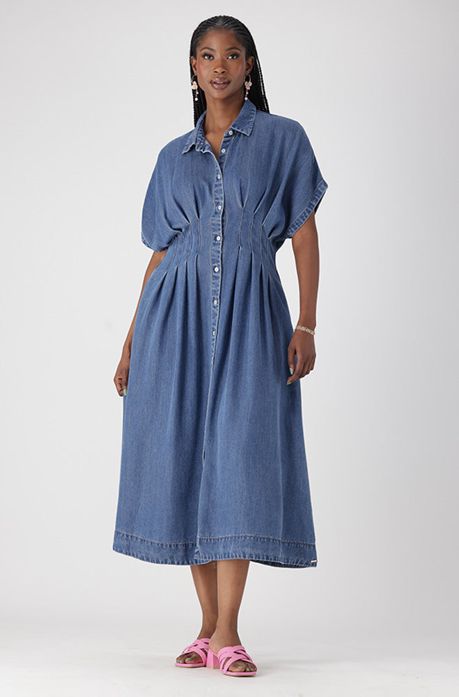 Classic denim dress featuring a functional button stand and flattering pleat detail at the waist for a structured silhouette. Designed with practical inseam pockets and a timeless maxi length for effortless everyday style.