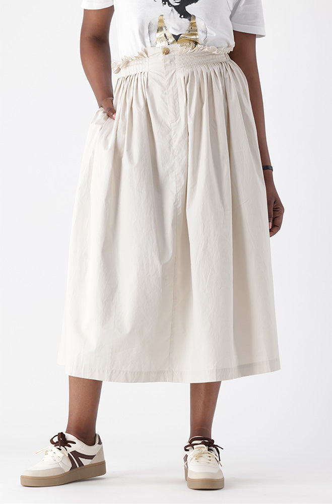 This flared skirt features neat pleats close to the waistband and a delicate frill detail for a feminine touch. Finished with a functional zip, hook button, and practical inseam pockets, it combines elegance with everyday ease..